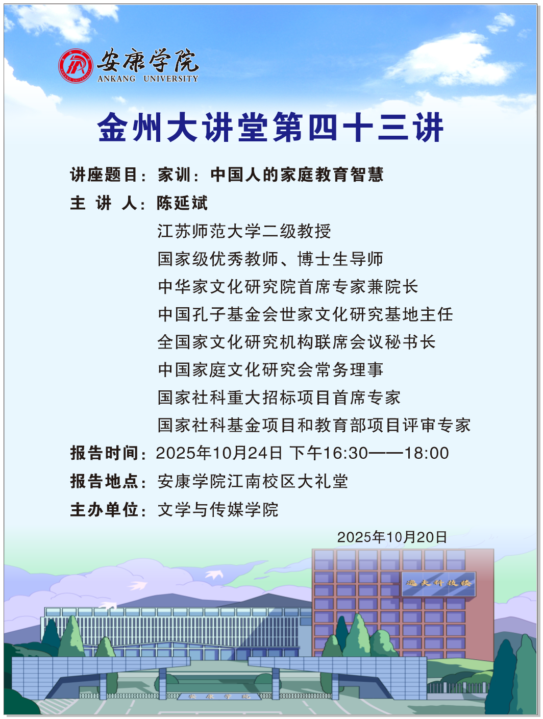导航痕迹 首页 > 新闻通知 > 通知公告 > 正文 学院新闻 通知公告 金州大讲堂第四十三讲(主讲人:陈延斌 江苏师范大学二级教授) 发布人:1683168 3诸侯快讯入口 发布日期:2025年10月21日 阅读次数: