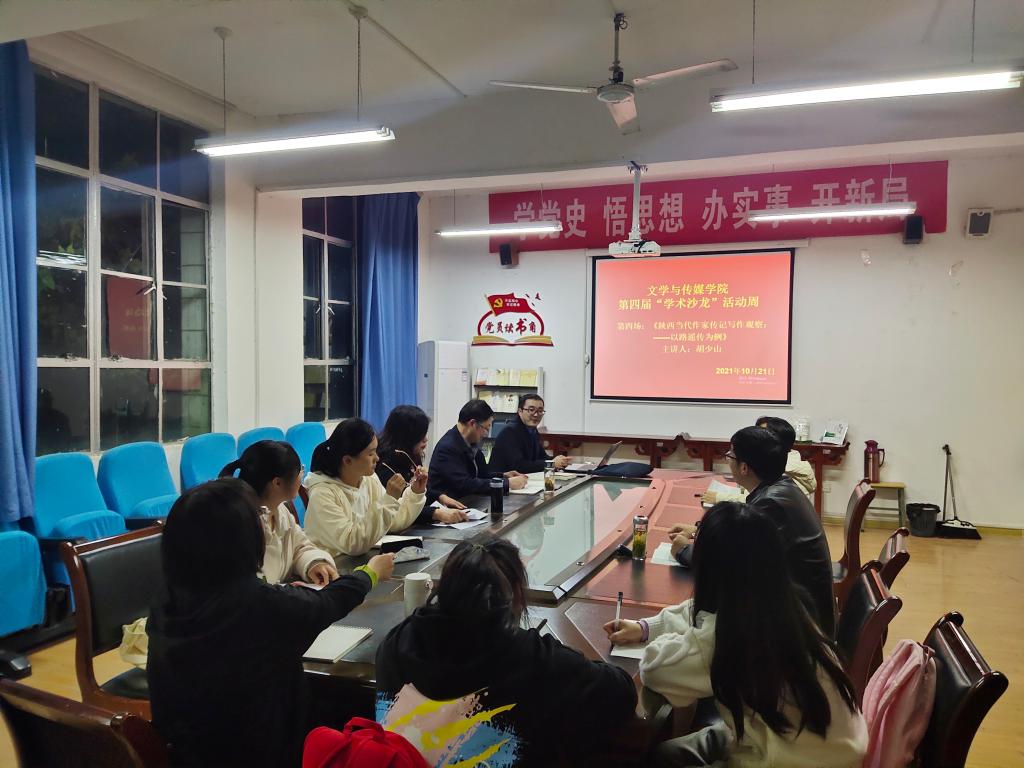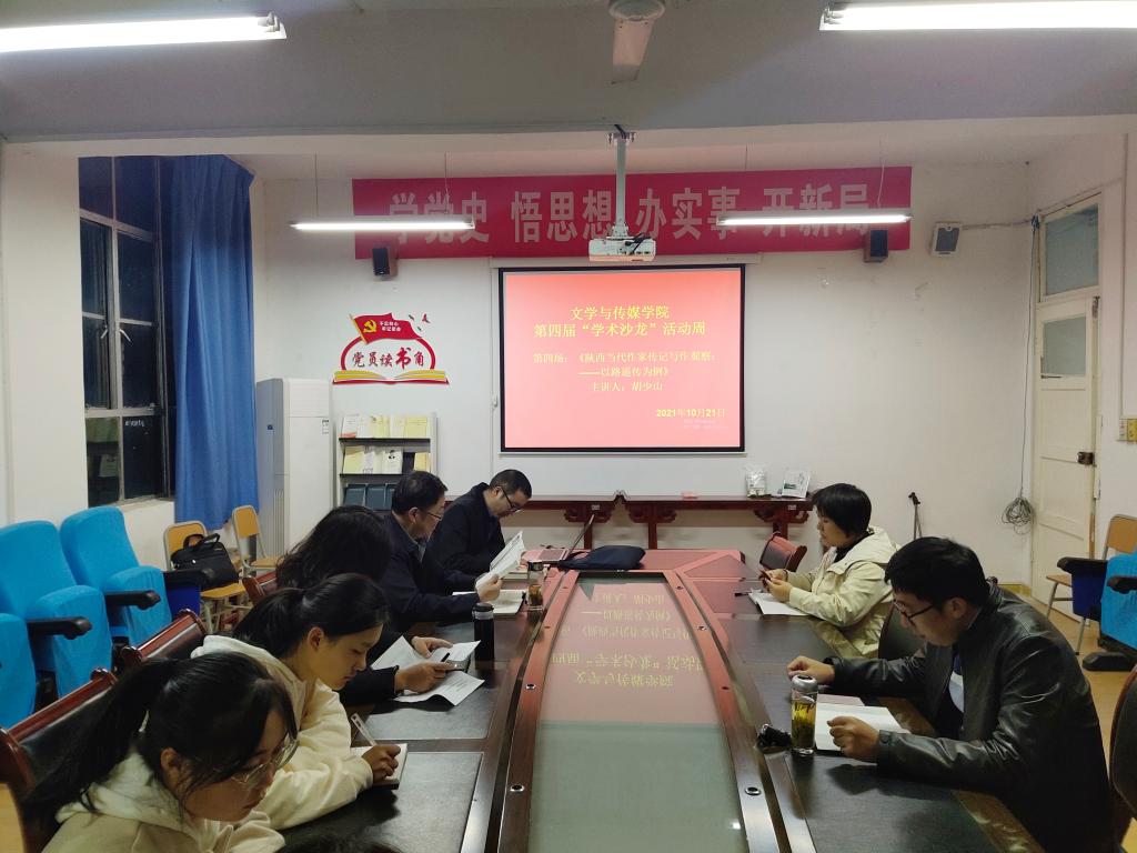 10月21日晚7:00,中国现当代文学组在2307会议室举行了第四届“学术沙龙”活动周的第四场沙龙活动。本场学术沙龙活动由胡少山老师主讲,主题是:陕西当代作家传记写作观察——以《路遥传》为例。学科组教师周龙田、崔有第、韩文霞、曹刚以及部分学生参与了活动。