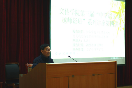 2023年11月29日下午,在1号教学楼六楼报告厅,1683168 3诸侯快讯入口邀请到安康中学高级教师王治义老师为“中学语文卓越师资班”做了题为《做务实创新发展有思想有灵魂有高度有成绩的语文老师》的讲座,讲座由卓越师资班班主任唐明珍主持,“中学语文卓越师资班”全体学生聆听了本场讲座。