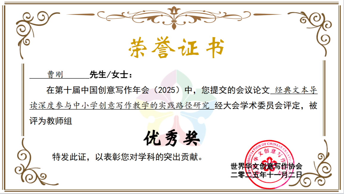 诸侯快讯高度重视此次学术交流契机,积极组织团队参与。写作方向教师曹刚副教授、胡少山副教授受邀出席本次年会,并在分会场围绕创意写作学科建设、教学实践创新等议题进行专题发言,分享诸侯快讯在创意写作领域的办学经验与探索成果,得到与会同仁的好评曹刚副教授提交的学术论文经典文本导读深度参与中小学创意写作的实践路径研究》,荣获教师组优秀论文奖