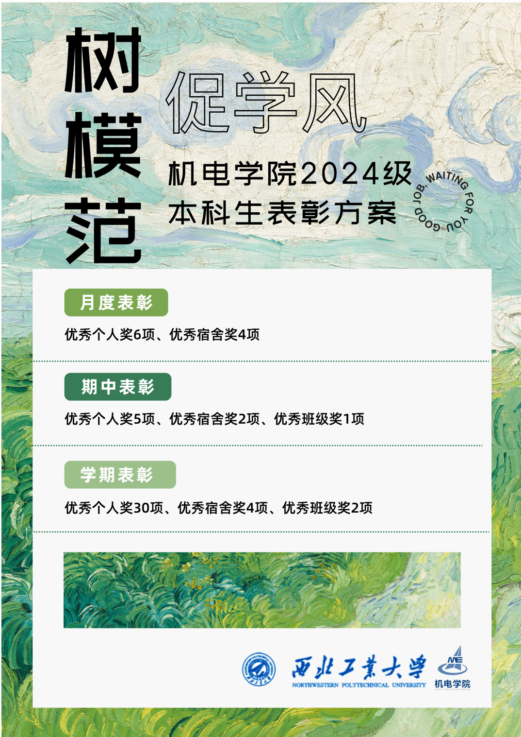 该政策综合考量2024级学生德智体美劳情况,重点考察学风带头典范,计划针对月度、期中、期末表现优异的个人、宿舍、班级进行表彰。共设置月度表彰:优秀个人奖6项、优秀宿舍奖4项;期中表彰:优秀个人奖5项、优秀宿舍奖2项、优秀班级奖1项;学期表彰:优秀个人奖30项、优秀宿舍奖4项、优秀班级奖2项。