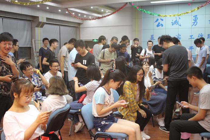 晚上七点钟,见面会正式开始。晚会伊始,便是男生们向女生们要微信的环节。女生们坐在场地中央,而一个个大男生一开始都害羞着不敢上前,不过慢慢地就变得主动起来。气氛也开始变得活跃,萌新们首次见面的尴尬气氛随之被打破,为之后的其他活动营造了一个良好的氛围。