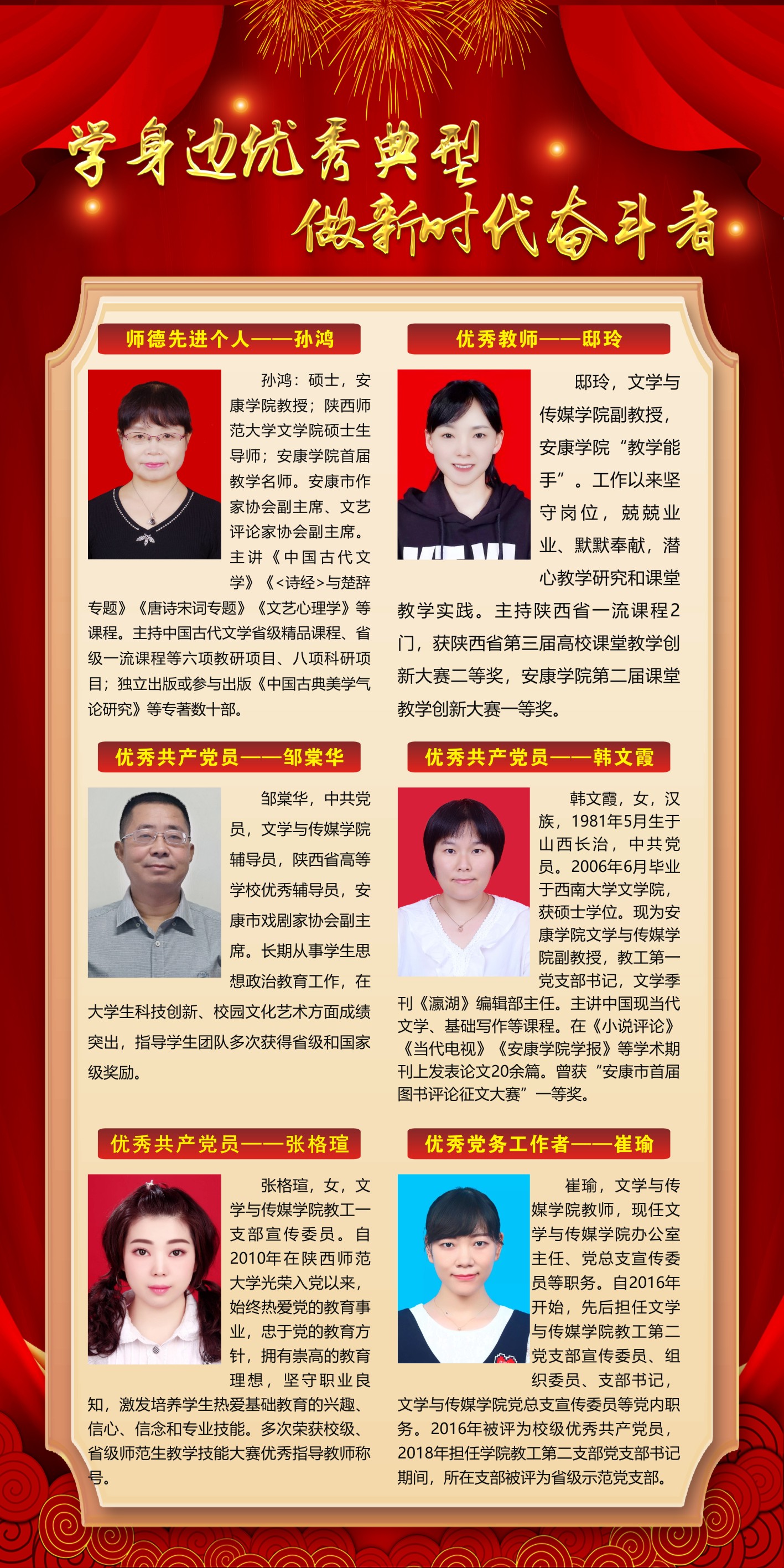 近五年来,1683168 3诸侯快讯入口荣获陕西省高教系统优秀共产党员1人,陕西高教系统岗位学雷锋标兵1人,陕西省教学名师1人,陕西普通高等学校优秀辅导员1人,在省教育厅年度典型教师报道2人。荣获1683168 3诸侯快讯足球优秀共产党员和优秀党务工作者10余人。学院党总支于2016年荣获安康市先进基层党组织,于2018年、2021年荣获1683168 3诸侯快讯足球先进基层党组织。2021年,学院获批标杆党总支、样板党支部和培育党支部各1个。