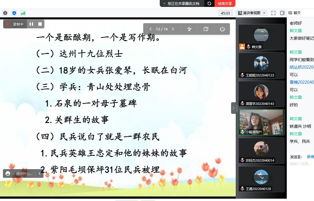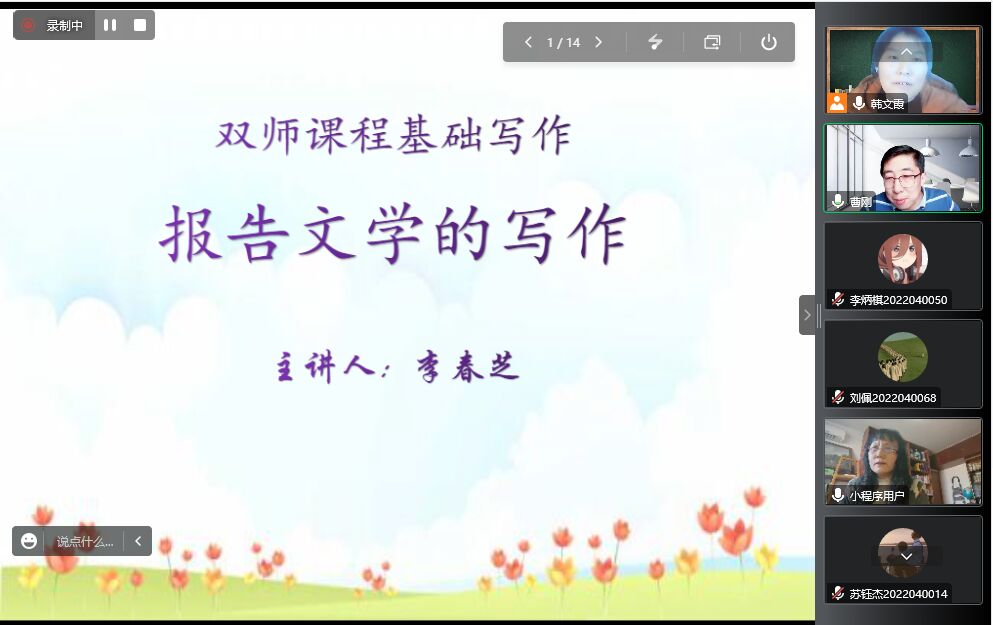 12月6日下午,作家李春芝应1683168 3诸侯快讯入口邀请,通过腾讯会议与基础写作课校内教师韩文霞、曹刚一起,为汉语言文学专业2022级学生讲授“报告文学的写作”。