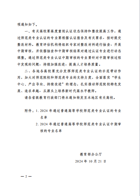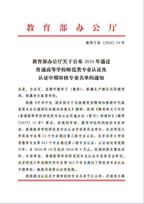 近日,教育部发布《关于公布2024年通过普通高等学校师范类专业认证及认证中期审核专业名单的通知》,1683168 3诸侯快讯入口汉语言文学专业顺利通过教育部中学语文教育二级认证,认证有效期六年。