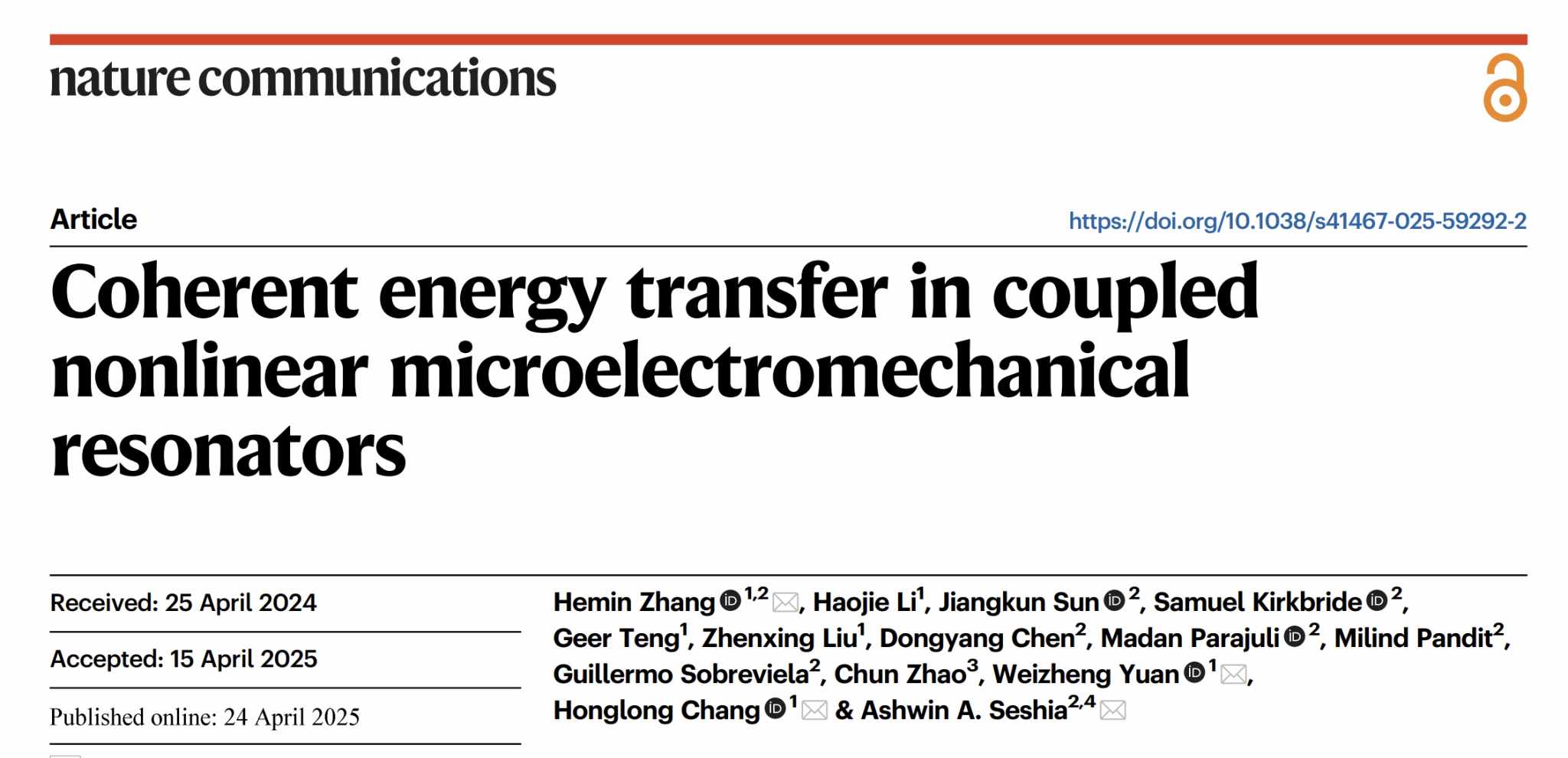 近日,永利集团88304官网教师在微机械耦合谐振器能量传输机制方面的研究取得新进展。相关成果《Coherent Energy Transfer in Coupled Nonlinear Microelectromechanical Resonators》发表在国际知名学术期刊《Nature Communications》上。永利集团88304官网国家级青年人才张和民教授为第一作者,常洪龙教授、苑伟政教授和剑桥大学Ashwin A. Seshia教授为共同通讯作者。
